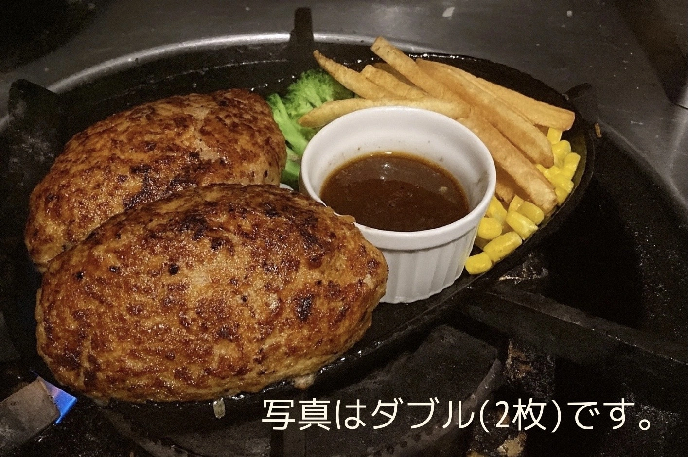 鉄皿に盛られたジュウジュウ熱々のハンバーグ、