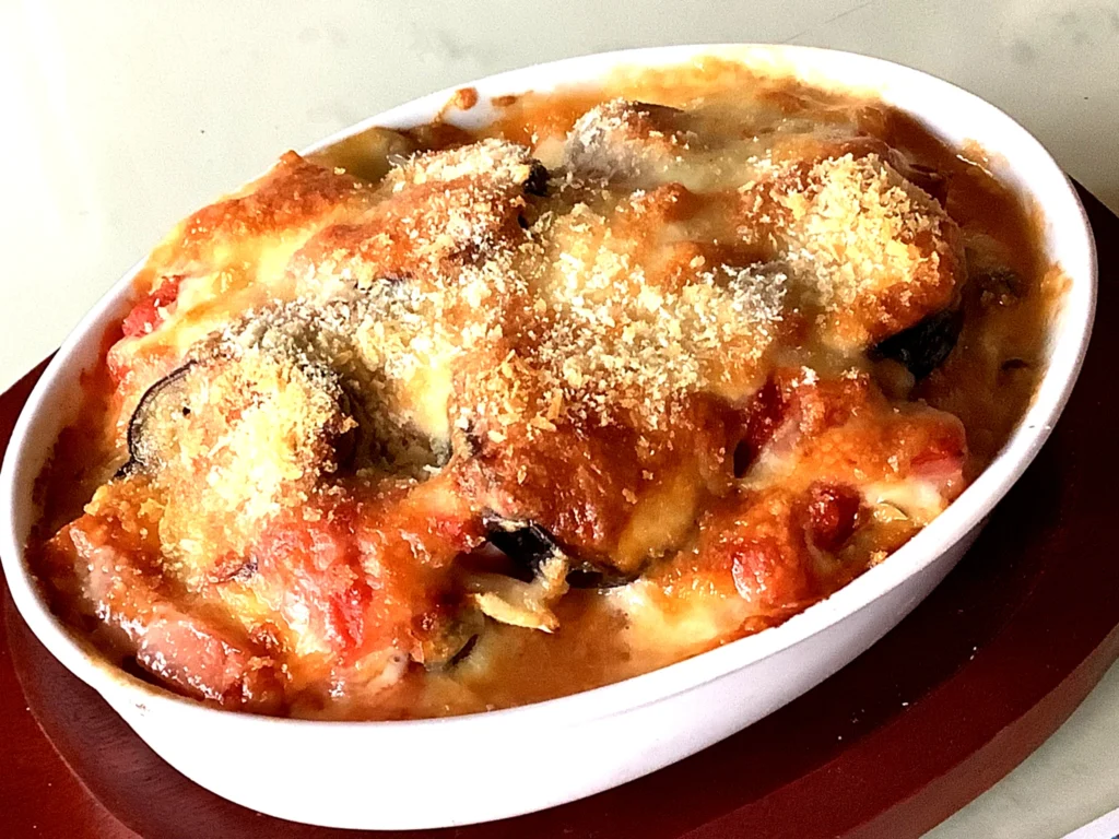 重めのベシャメルにベーコン、茄子、しめじをのせてトマトソースをかけた2色ソースのグラタンです。